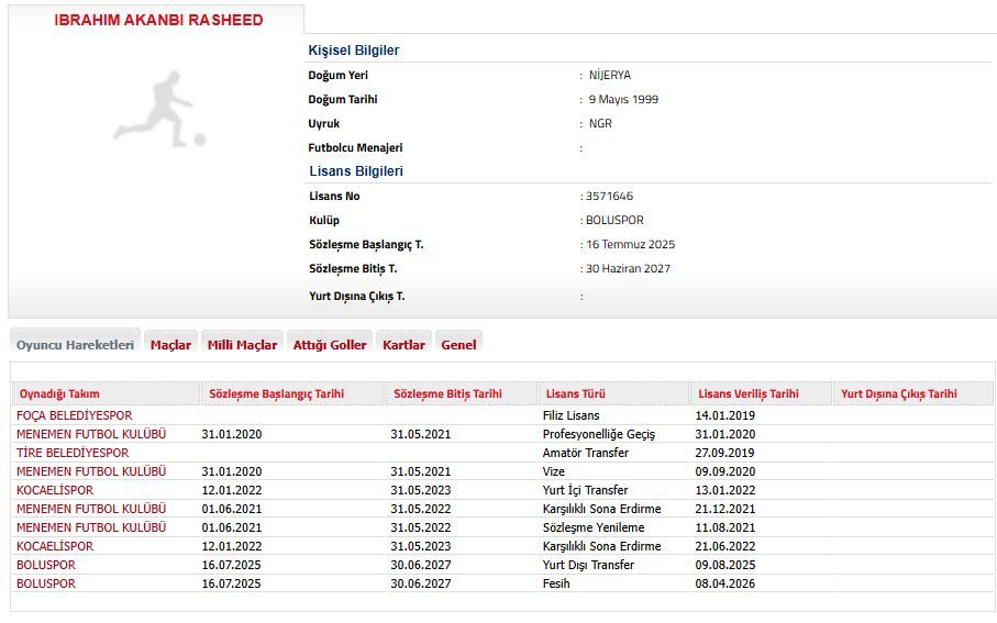 2025 yılında Boluspor kadrosuna katılan Rasheed Ibrahim Akanbi, kırmızı-beyazlı formayla çıktığı 32 maçta 4 gol ve 7 asistlik performans sergiledi. Hücum hattına yaptığı katkıyla zaman zaman dikkat çeken Nijeryalı oyuncunun ayrılığı, takımın ofansif gücünde nasıl bir etki yaratacağı konusunda soru işaretlerini beraberinde getirdi.